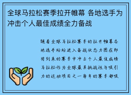 全球马拉松赛季的拉开意味着各地选手进入了新一轮的备战周期。在这个过程中,备战计划的制定、心理调适的加强、先进训练技术的应用和赛事预测策略的优化,都是选手全力备战的关键要素。每一位顶级选手都在不断精进自己的训练方法,力争在新的赛季中创下更好的成绩。而这些努力背后,不仅是对个人极限的挑战,更是对马拉松精神的深刻诠释。